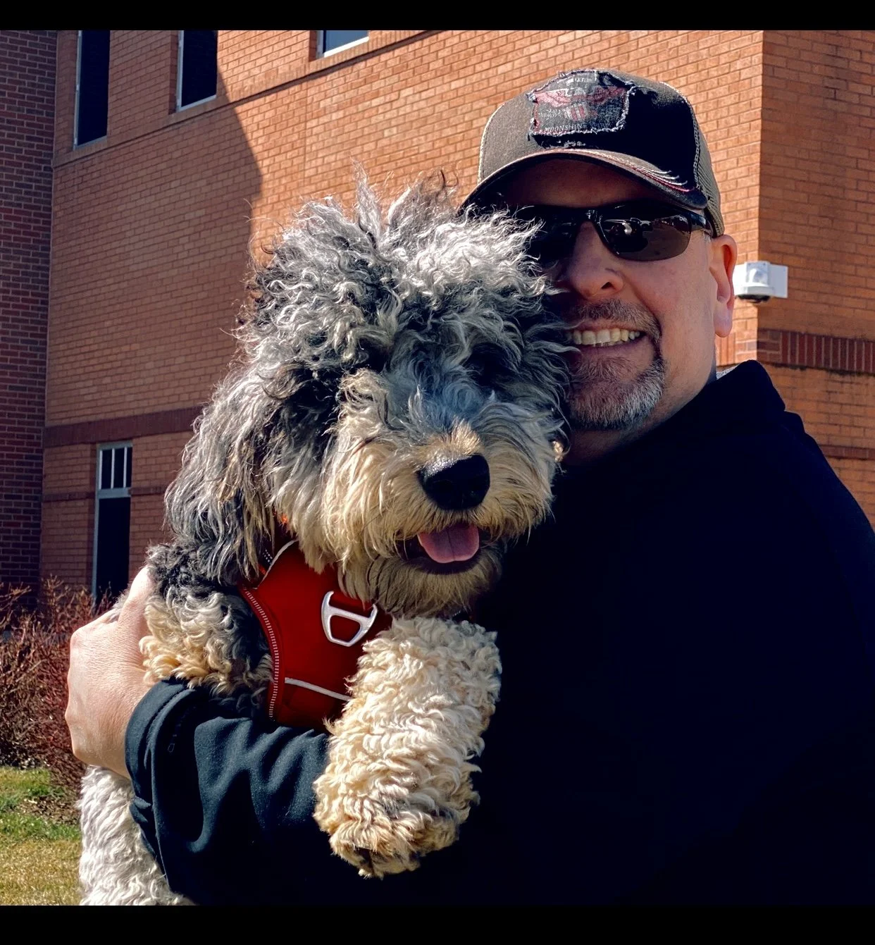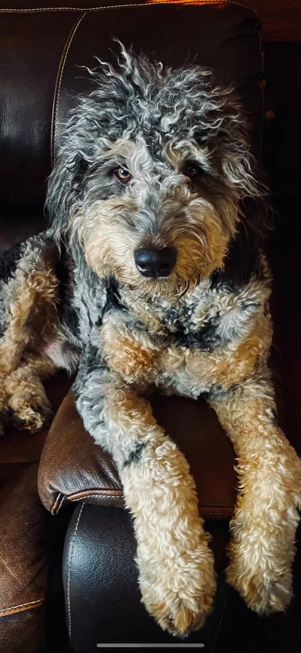 Hi! My name is Cooper. I am an F1 Mini Bernedoodle. My day consists of dancing with my human mom, posing for photos, looking at myself in the mirror admiring my beautiful blue, brown and black hair (now, don’t be jealous of my curly locks), taking naps, playing outside, snuggling and cuddling with my “humans”! Most of all smiling, and bringing joy to everyone I meet. Everyone needs a doodle like me!!!