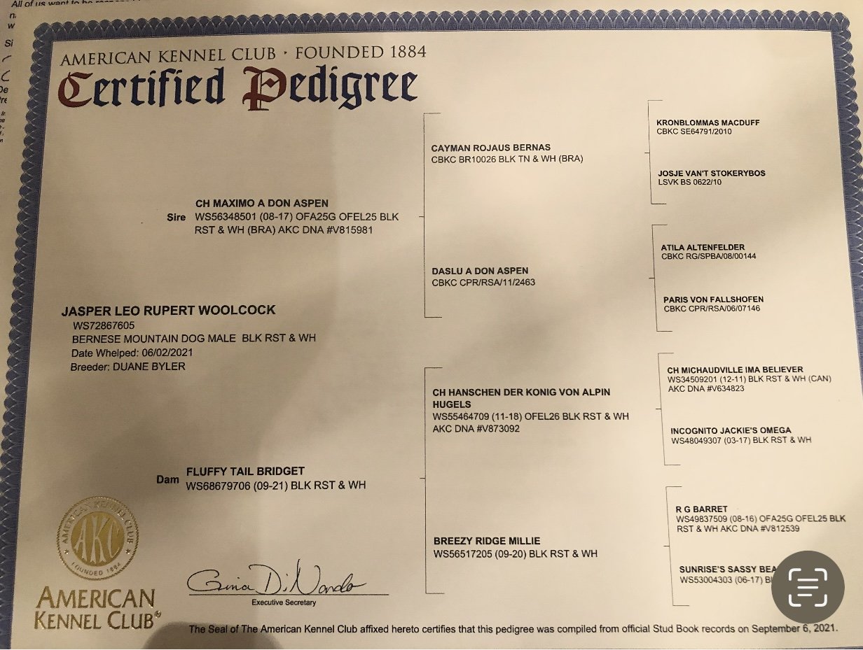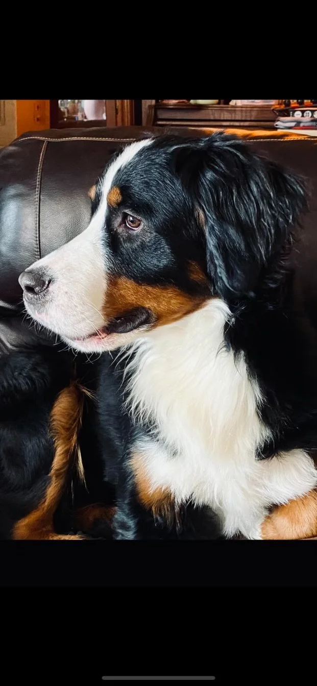 Jasper is a registered AKC Bernese Mountain Dog known for his warm heart and impressive stature. Weighing in at 120 pounds, he truly embodies the term “gentle giant,” greeting everyone he meets with calm affection and an unmistakable charm.